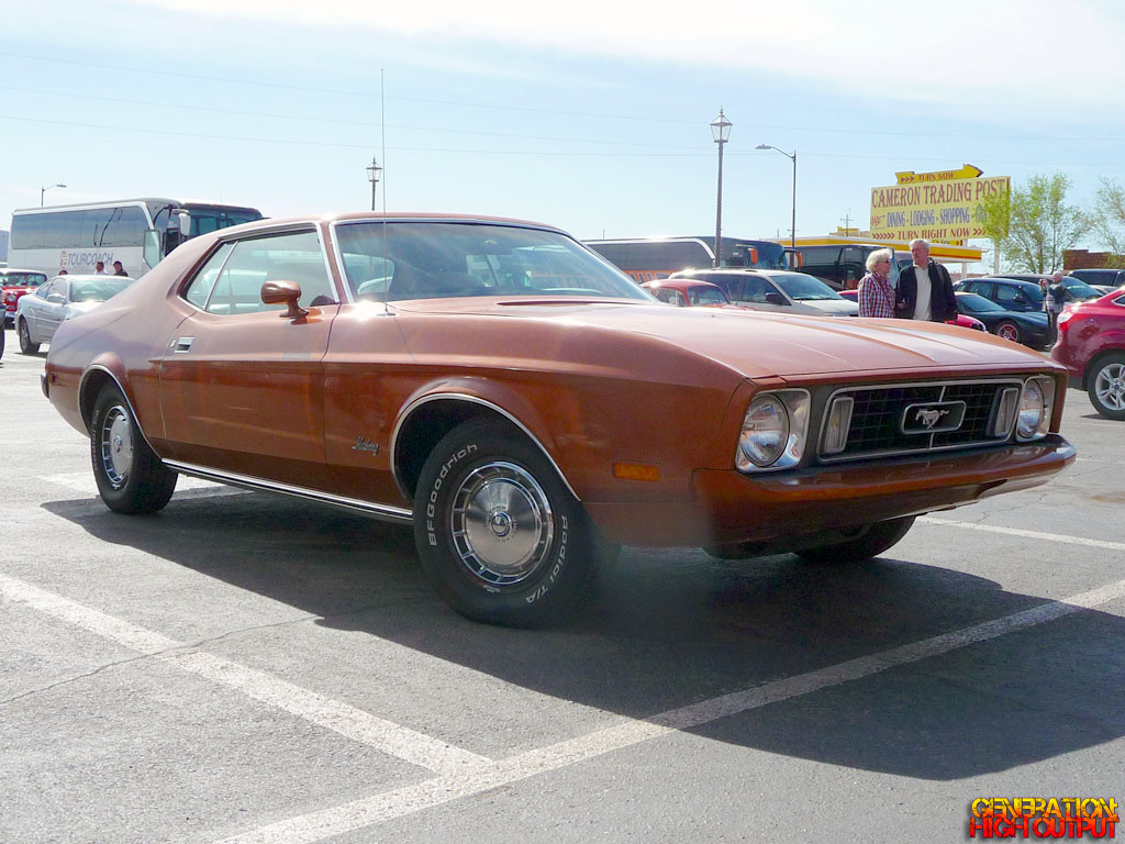 I ran across this Mustang in the town of Cameron, Arizona – a small trading post and tourist stop on the way to the Grand Canyon. It was parked close to a group of other classic cars which I presume were on a cruise together. You can tell it is a 1973 by the vertical turn signal indicators in the front grille.
