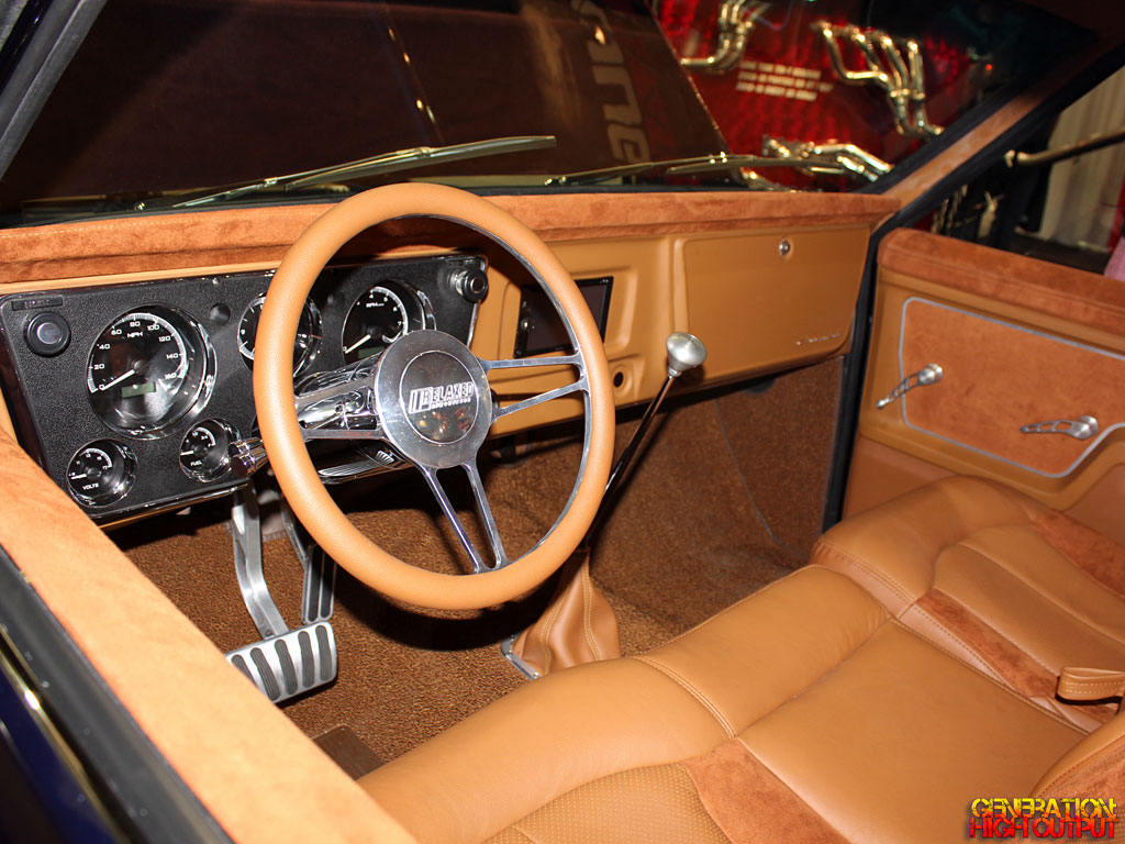 This K/10 was laying frame thanks to Airlift Performance parts and Viair compressors. At normal ride height, it handles well thanks to its Specialty Suspension components and QA1 shocks. I’ve got no idea about which wheel and tire combo they went with. It was painted a beautiful metallic blue paint job with House of Kolor paints and a light shade of wood in the bed.
