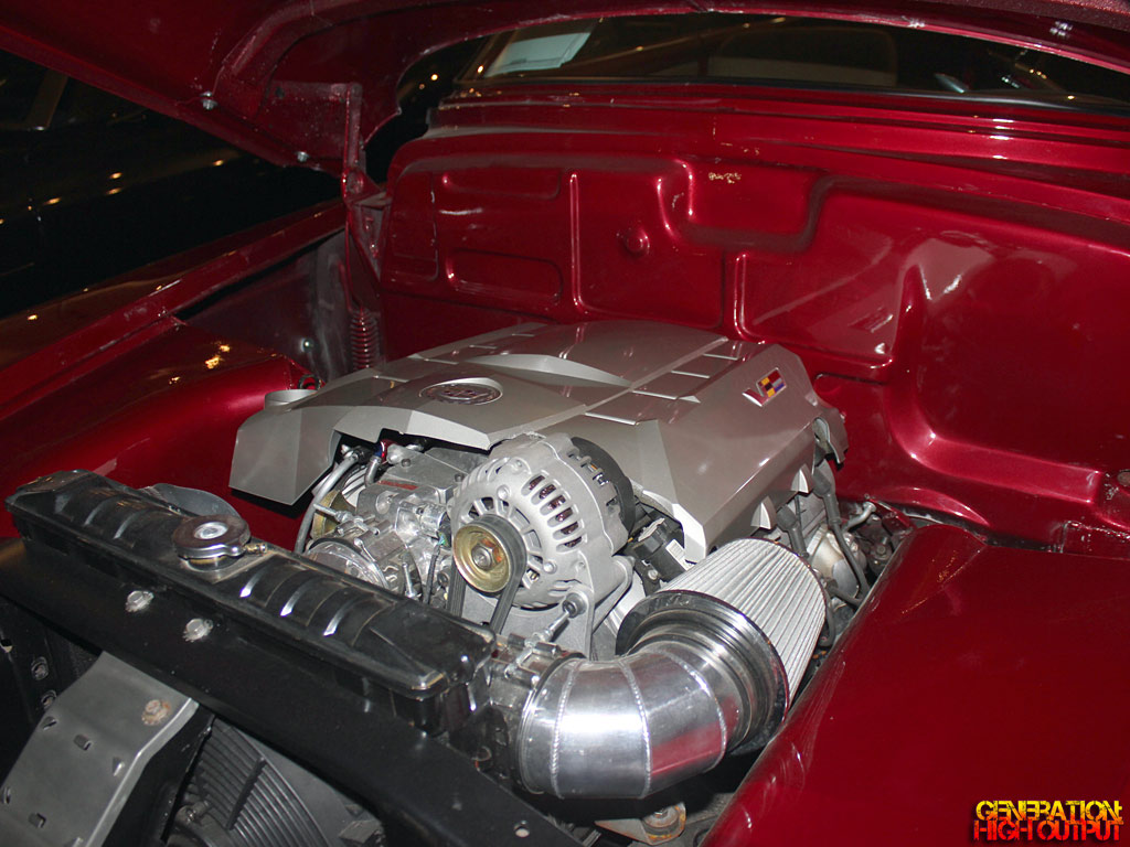 From what I could tell, this car began life as a 1951 Cadillac DeVille and was at some point turned into a chop-top roadster. The engine has been swapped out for a Chevrolet LS V8 power plant with a 4L60E automatic transmission. The interior has been redone in tan leather while the exterior has been resprayed a laser red metallic color.