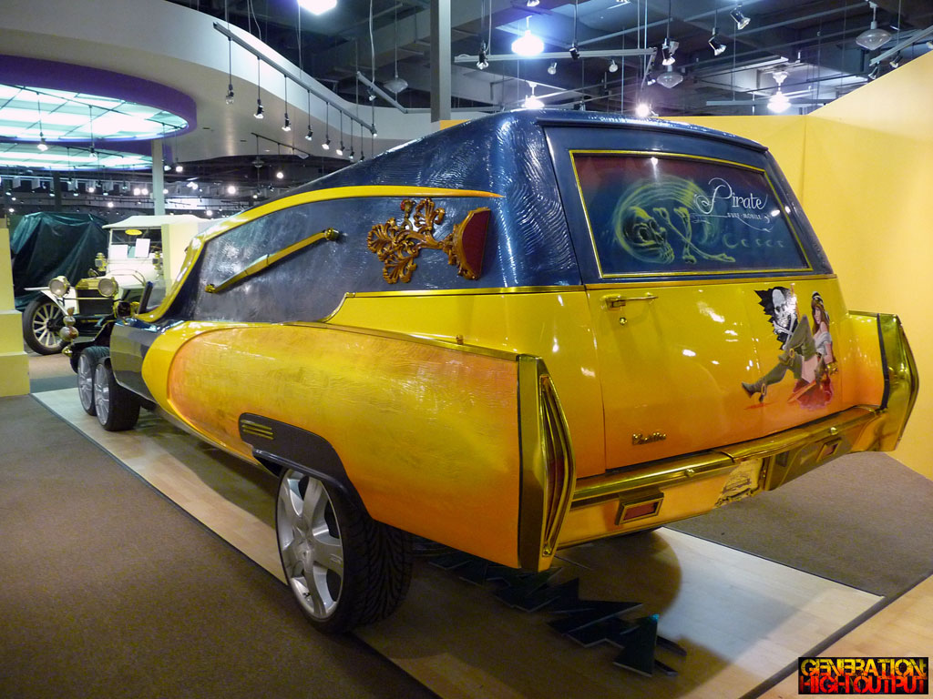 For example, this car began its life as a Cadillac Eldorado hearse. It was then transformed into the Pirate Surf Mobile by art car builder Richard Fletcher. From the double front axle to the two-tone blue and gold paint, this 28-foot long vehicle really stands out from the crowd.