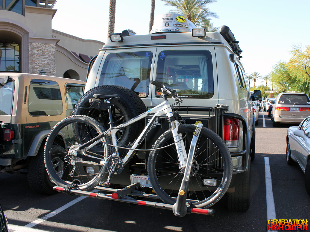 Salem-Kroger installs the pop-up roof, beefed up suspension, and the interior cabinets and bedding to the customer’s specifications. As you can see, this van has been customized with a roof rack, bike rack, and some additional lights on the rear. It is ready for whatever adventures you may encounter.