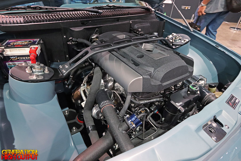 The Camaro’s original chassis has been replaced with an Art Morrison chassis with a fully independent rear suspension. Under the hood is a GM Performance LT376/535 crate engine producing 535 horsepower, coupled to a GM 8L90E 8-speed transmission. The engine is hidden beneath a custom made air intake and engine cover that were fabricated for this car, giving it that show car look when the custom built hood is open. Everything from the fender liners to the radiator support was custom made for this car, then painted to match the exterior body color, which is a custom mixed BASF Refinish blue with accent stripes.