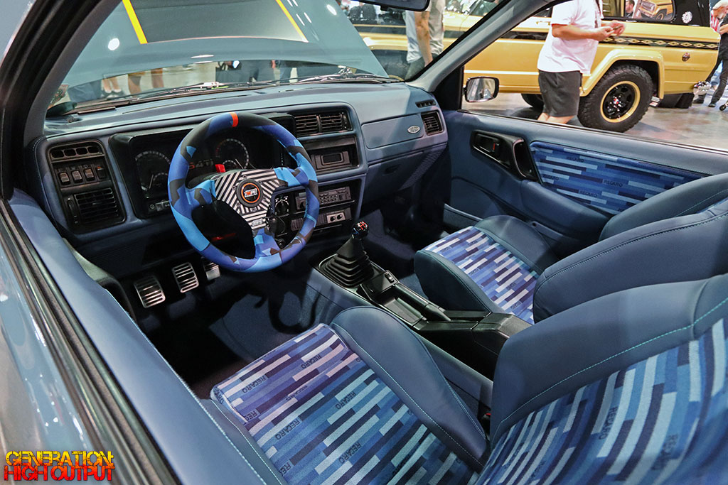 The car also features tons of one-off machined parts. Look closely and you will see a hexagon pattern, which is repeated in the front grille, the brake reservoir cover, the machined AC vents, the hood cowl vents, the speaker grilles in the rear dash and even the inserts of the front bucket seats. Even the gauge cluster has a subtle 6-sided surround to it.