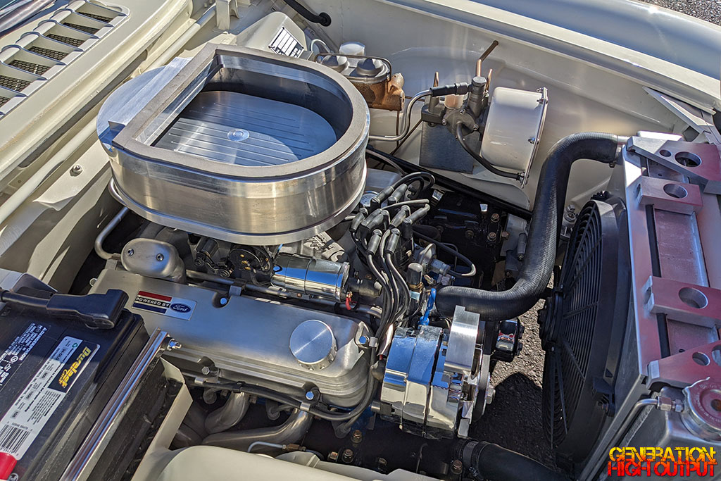 The original 1.8L engine has been replaced by a small block Ford V8 engine under the hood. A set of stainless headers and an Edelbrock intake adorn the engine, which sits beneath a custom air intake. An oversize aluminum radiator and electric fan help keep this thing running cool. Power is delivered to the rear wheels via a manual gearbox.