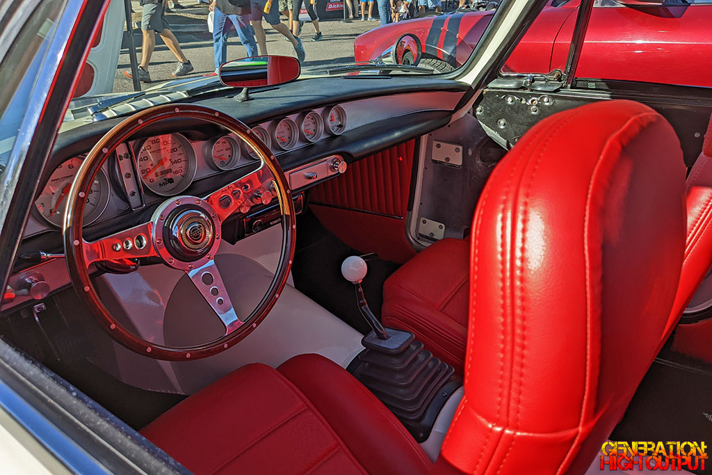 The exterior is a light gray-ish color over a vibrant red interior. A full set of Auto Meter Pro Comp gauges are beautifully integrated into the original dashboard, which sits behind the wooden steering wheel.