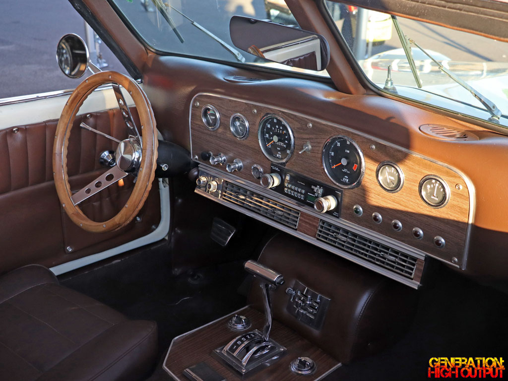 The dashboard has a cassette player radio, air conditioning, and all the faux woodgrain trim and brown vinyl upholstery you can handle. The layout is unconventional with the speedometer and tachometer in the center of the very flat dashboard.