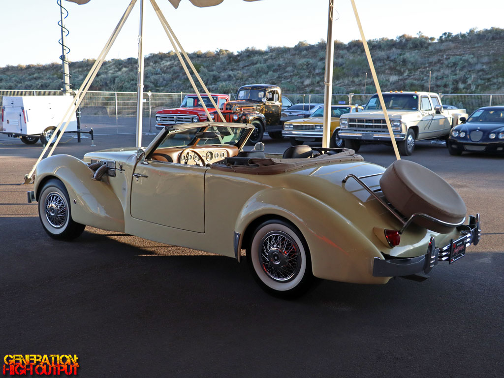 It has a manually-operated convertible top over two bucket seats up front. The vehicle is equipped with power steering, disc brakes, chrome wheels, and a rear luggage rack. Interestingly, the car does feature rear-hinged doors and white-wall tires, like the original upon which it is based.