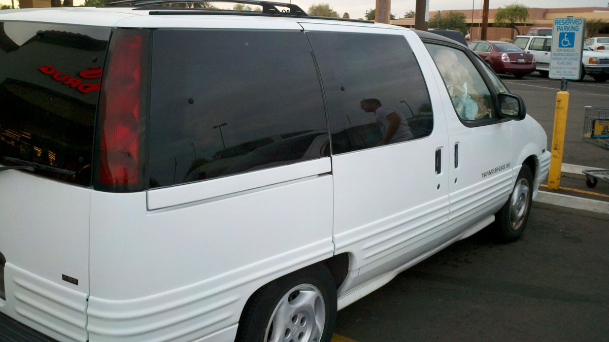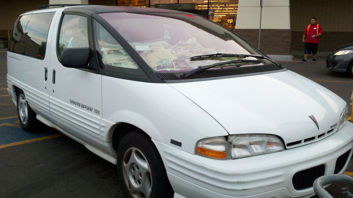 I saw this van at a grocery store a couple days ago. When I was taking pictures of it, an employee came outside and told everything he knew about the lady who drives it. Apparently, she goes to the store every day around noon and hangs out all day near the deli until they close at night. I actually feel kind of bad to post this but at the same time, I’m not happy about having to share the road with someone who drives around with such an unsafe amount of visibility-blocking bullshit in their vehicle, so whatever.