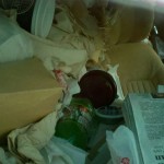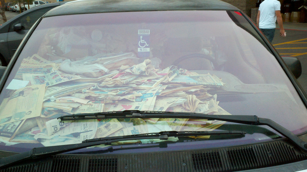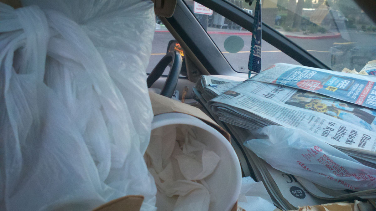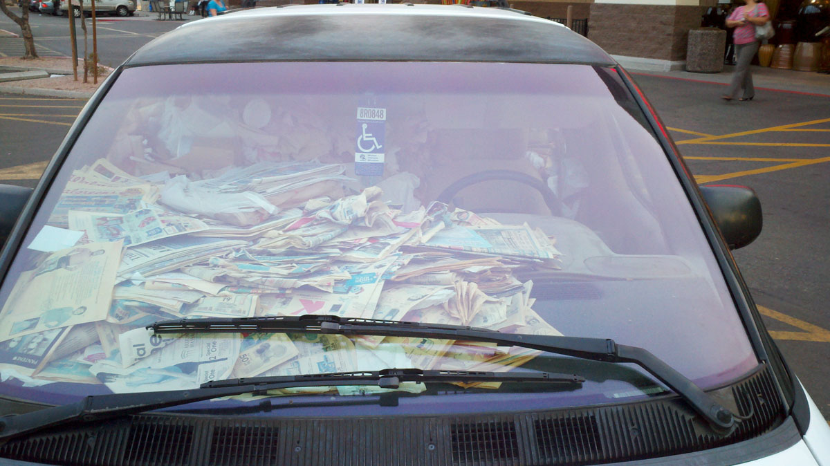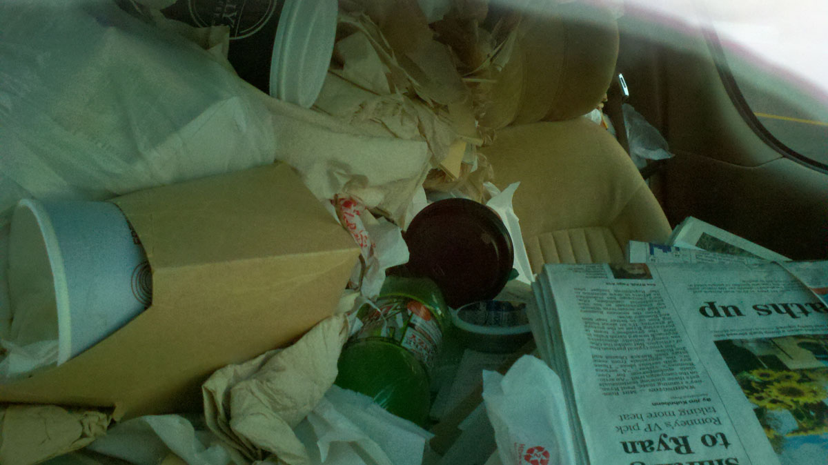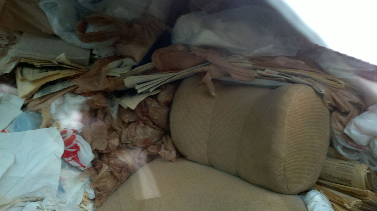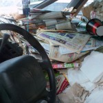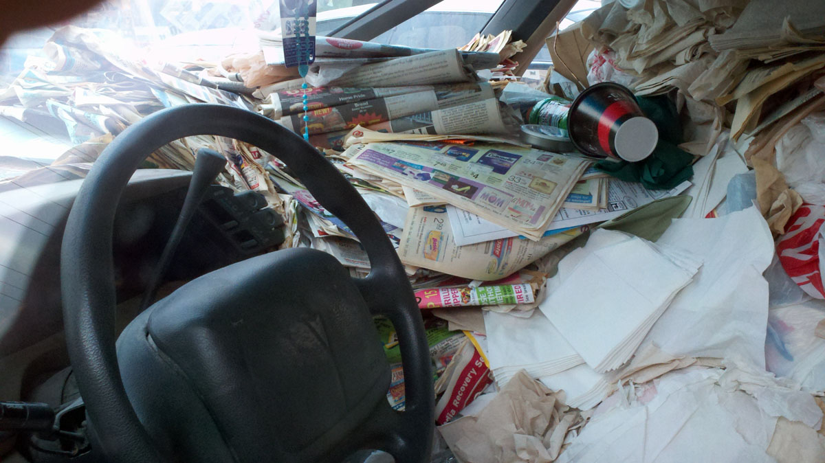 The van is so full of papers and garbage that there is “litteraly”(sorry) only room for one person to fit inside. It’s definitely a fire hazard, there’s no disputing that, but I wonder if driving around totally enshrouded by paper actually would protect you in the event of an accident, like packing peanuts. You don’t just drive this van to your destination, you fucking pack and ship yourself there!
