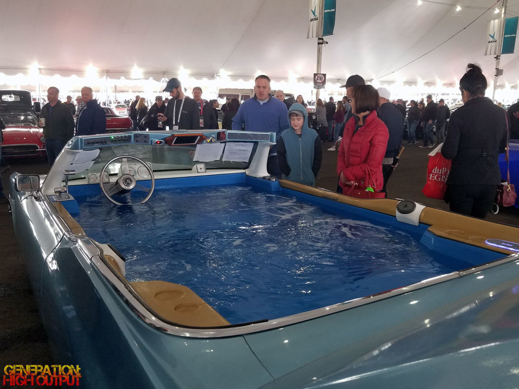Someone took a 1969 Cadillac de Ville convertible and turned it into a jacuzzi hot tub on wheels. The interior has been replaced by a custom 370-gallon fiberglass hot tub. It is fully functional with the pump and filter in the trunk, and engine-heating of tub water to fully adjustable temperatures of up to 110 degrees Fahrenheit. The car holds the Guinness World Record for “World’s Fastest Mobile Hot Tub,” set in Bonneville, UT in 2014. The “Carpool de Ville” has appeared on CNN, Good Morning America, and Jay Leno’s Garage. It was auctioned off at Barrett-Jackson’s Scottsdale 2019 collector car auction, where it sold for $26,400.