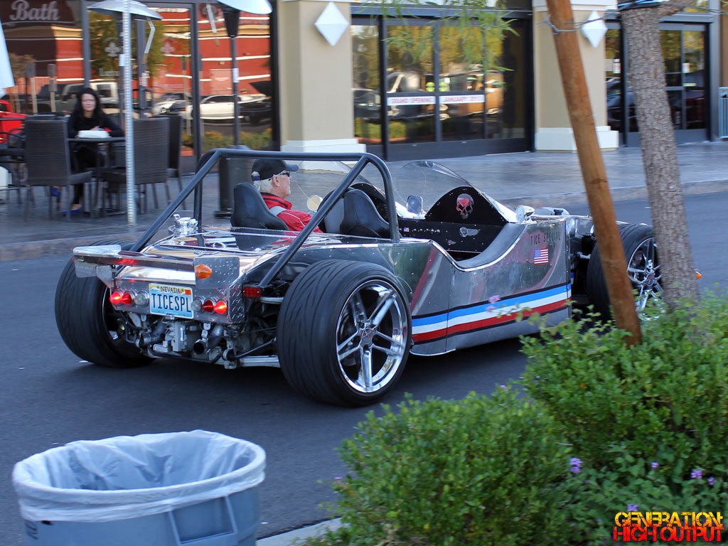 Well, I saw this homemade C5-based Corvette kart car in Las Vegas in 2012. Branded as “Tice Special” it features riveted aluminum bodywork, twin motorcycle-style windscreens, and a chrome skull on the dashboard. It’s definitely faster than any car I own, but the fit and finish of this car leaves no doubt that this was a weekend project in someone’s garage.