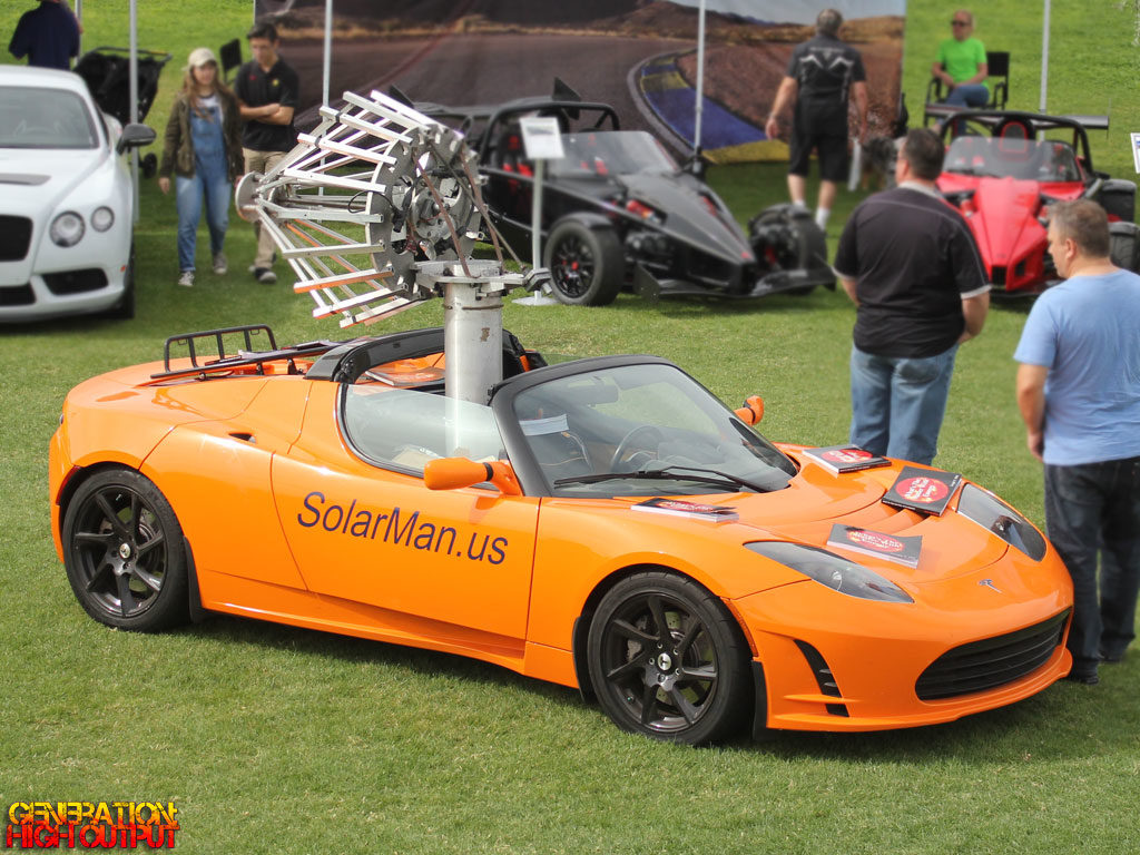 The owner of this car made several appearances at Phoenix-area car shows, delivering parking lot lectures on solar energy and physics. He is a professor and inventor of a solar awning. He has removed the passenger seat from his Tesla Roadster and replaced it with a solar device of his own design, which looks rather interesting, to say the least. “SolarMan” at one point launched a crowdfunding campaign to build a 5-acre solar manufacturing facility / amusement park in Arizona.